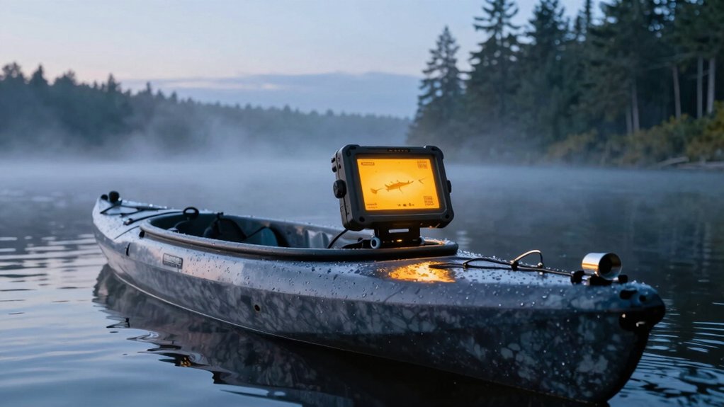 Since you’re out on the water where rain, spray, and temperature swings are part of the game, your castable fish finder needs to handle the elements without failing. You’ll want a model with at least an IP67 waterproof rating so it survives splashes, drops in the drink, or sudden downpours. Pick one built to operate in a wide temperature range—like -10°C to 50°C—so it works reliably whether it’s freezing or blazing hot. Look for rugged, impact-resistant materials; they’ll protect it when you accidentally drop it on the kayak deck or hit it against gear. You also need a battery that lasts 8 hours or more, so you’re not scrambling to recharge mid-trip. And go for a lightweight design—it won’t throw off your kayak’s balance or wear you down when porting or casting often.