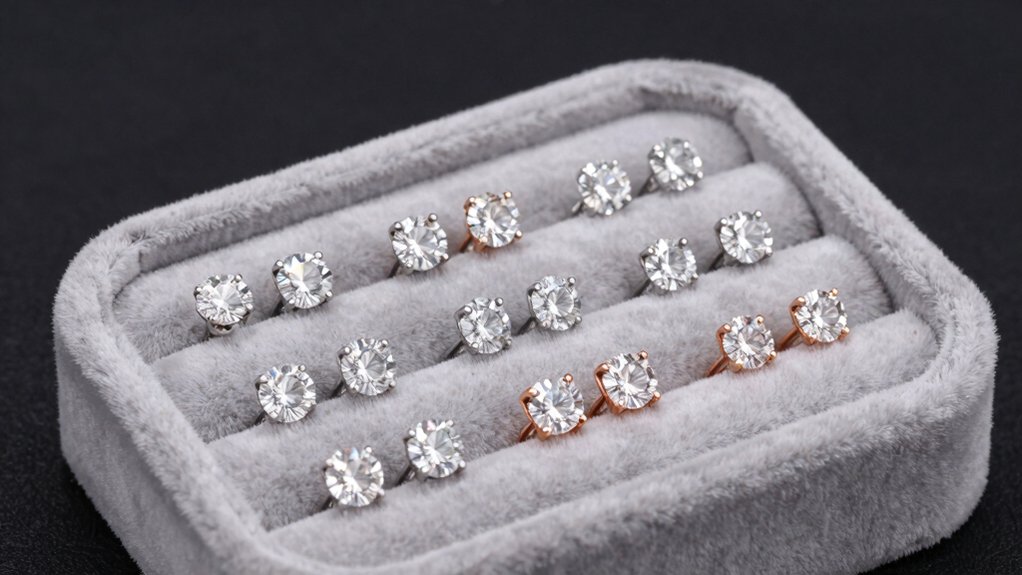 A range of metal options shapes the look and longevity of your diamond stud earrings, so choose one that matches your lifestyle and style. If you want durability and a classic feel, go for solid gold—14k or 18k—since it resists wear and offers rich color. Prefer a bright, modern look? White gold gives you that sleek finish, especially if it’s palladium-based and nickel-free, making it safer for sensitive skin. Don’t overlook sterling silver—it’s affordable and shines beautifully when rhodium-plated, though it needs occasional upkeep to prevent tarnishing. Lab-grown diamonds often pair with 14k gold or sterling silver, blending ethics with elegance. Think about your daily activities, how heavy the earrings feel, and whether you react to certain metals. The right metal doesn’t just highlight your diamonds—it lasts longer and feels better every day.