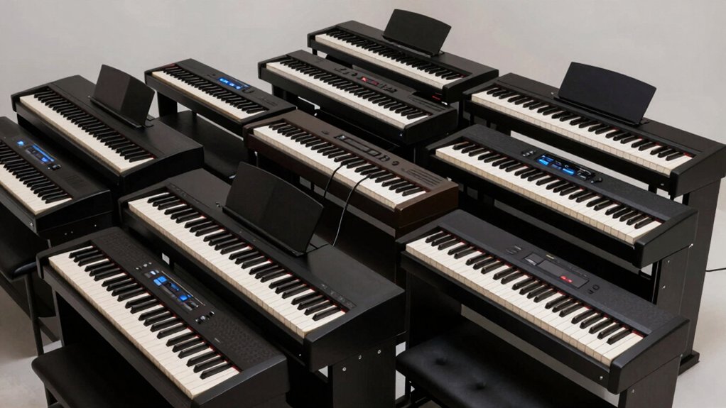 If you’re always on the move, you’ll want a digital piano that keeps up with your lifestyle. Look for lightweight models—some weigh as little as 6.6 lbs—so you can carry them comfortably to gigs, lessons, or rehearsals. Built-in battery power lets you play anywhere, even without an outlet nearby. Compact or folding designs save space and make transport easier, especially in tight apartments or crowded transit. Many portable keyboards come with integrated carrying cases, giving you protection and hassle-free hauling. Don’t overlook design: sleek, modern finishes blend well with your home decor while keeping the instrument ready for practice. A well-designed keyboard doesn’t sacrifice style for function—it nails both. When you balance weight, size, power options, and aesthetics, you get a digital piano that fits your life. Choose smart, stay mobile.