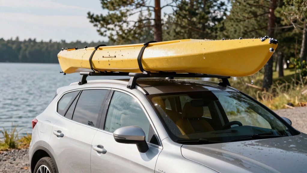 While hauling your kayak, security should never be an afterthought—choose roof racks with tie-down straps rated for at least 600 pounds to keep your load locked down. Use anti-slip buckles and anti-loosening screws so vibrations don’t loosen your setup on bumpy roads. You’ll want foam padding or protective cushions built into the racks; they reduce hull damage and minimize shifting. Pick a design with solid attachment points that hold your kayak firmly across the bow, stern, and cockpit. Whether you’re carrying a narrow touring model or a wide recreational kayak, opt for racks that adjust to different shapes and sizes without sacrificing stability. Don’t assume one-size-fits-all—test how snugly your kayak sits before hitting the highway. With the right combination of secure straps, cushioning, and smart engineering, your gear stays put, no matter the drive.