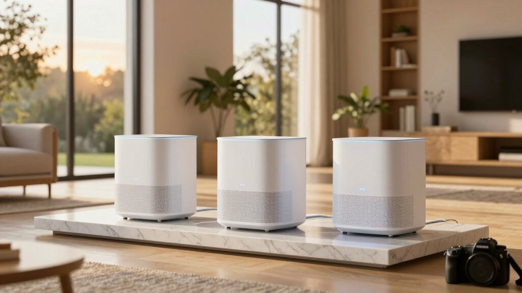 While coverage area varies across models, choosing a mesh WiFi 7 system means guaranteeing every corner of your large home stays connected. You’ll find systems covering 2,600 sq. ft. to over 8,500 sq. ft., depending on the pack size. A 3-pack can reach up to 7,600 sq. ft., making it ideal for expansive homes. You need to place nodes wisely—each unit’s range impacts overall performance, and poor placement creates dead zones. Advanced features like Multi-Link Operation (MLO) and enhanced antennas help maintain strong, stable signals across longer distances. These technologies let you stream, game, or work anywhere without lag or disconnections. Don’t just rely on total advertised coverage; check individual node reach and spacing guidelines. You’re responsible for optimizing placement to get the most from your system’s potential. Smart planning guarantees seamless coverage where you need it most.