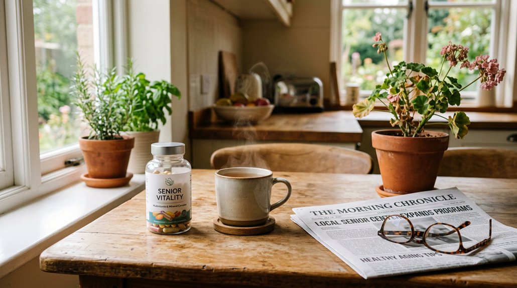 Because your body changes after 50, you’ll need more vitamin D, calcium, and B‑vitamins to keep bones strong, energy flowing, and cognition sharp. In your 50s and early 60s, focus on vitamin D3 and calcium to preserve bone density and support muscle function. B‑vitamins—especially B6, B12, and folate—fuel metabolism and protect mental clarity. Add antioxidants like vitamins C and E, plus zinc, to bolster immunity and brain health. Once you hit 65, formulas often shift toward nutrients that target memory, heart, and eye health, reflecting higher risks of cognitive decline, cardiovascular disease, and macular degeneration. Choose a multivitamin that matches these age‑specific priorities, ensuring each dose supplies the essential micronutrients your body now demands.