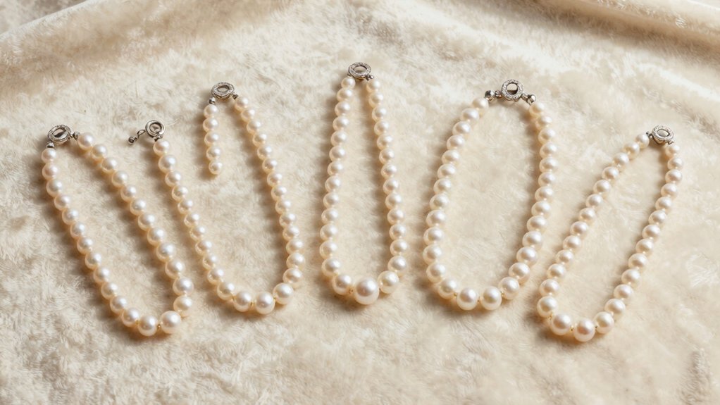 Three key factors define the quality of your pearl necklace set: pearl type, surface perfection, and nacre thickness. You’ll find freshwater cultured pearls popular for their affordability and bright luster, while South Sea and Tahitian pearls offer bold size and rarity. If you want classic elegance, Akoya pearls deliver perfectly round shapes and sharp reflective surfaces. For top quality, aim for AAA-grade pearls—they’re highly lustrous, nearly blemish-free, and usually size 7.5 to 10 mm. Surface smoothness matters; fewer flaws mean better appearance and higher resale value. Nacre thickness impacts durability, too—thicker nacre resists wear, keeping your pearls beautiful longer. Choosing the right type and quality guarantees your set looks stunning and stands the test of time, whether you’re dressing up or keeping it simple.