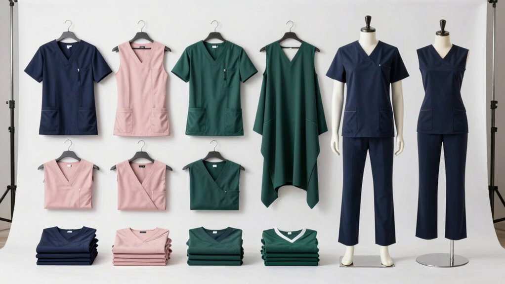 While a sleek design grabs your attention, it’s the durability and quality of a scrub set that truly keep up with your demanding schedule. You need fabrics that won’t quit—polyester-spandex blends hold their shape and resist wear, even after countless shifts and washes. Look for reinforced stitching; it stops seams from splitting under stress and extends the life of your scrubs. Wrinkle-resistant, moisture-wicking materials keep you looking sharp and feeling cool during long hours on your feet. High-quality sets won’t fade or shrink, staying colorfast and fitting true after repeated machine washing. Smart features like water-repellent fabric don’t just boost longevity—they make clean-up easier. When you choose scrubs built with tough, functional details, you’re not just dressing for the day—you’re investing in gear that works as hard as you do, shift after shift.