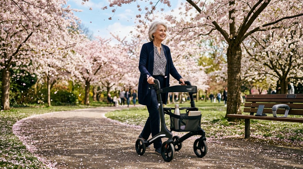 Looking to keep your walker looking as sharp as it moves? Pick colors that echo the frame or upholstery, creating a seamless visual flow. When a brand tags certain shades as “great colors,” you’ll usually find a solid palette that works well together. Choose accessories that come in multiple hues—pink, purple, blue, and more—so you can align them with your personal style. Bright, distinctive tones boost visibility, making it easier for you or caregivers to spot the attachment quickly. Also, match the accessory color to any bag or basket accents you already have, ensuring a unified aesthetic that feels intentional rather than haphazard. By balancing personal preference with safety and coordination, your walker will feel like a stylish extension of you.
