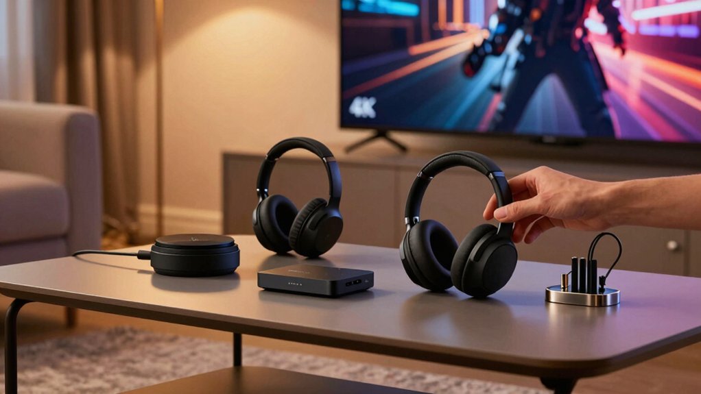 Yes, you can use them with hearing aids or cochlear implants since they support Bluetooth audio streaming and include audio passthrough modes. You’ll get clear sound without feedback if your devices are Bluetooth-compatible. Just pair them through your TV’s audio output or a streaming device. Some models even offer adjustable audio delay and volume balance so you can fine-tune the experience for clearer dialogue and better sync.